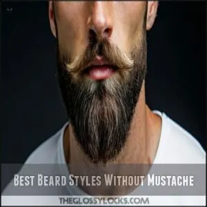 - You’ll find numerous stylish options for beards without mustaches, including chin straps, goatees, Lincoln beards, and soul patches that can enhance your facial features without the hassle of mustache maintenance.