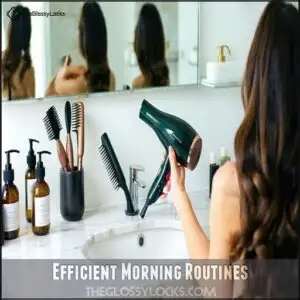 Speed styling with the right product selection extends hairstyle longevity. Morning prep becomes easier when you master these easy hairstyles, and tool efficiency means you’ll save time without sacrificing polish. By incorporating time saving techniques into your daily routine, you can achieve a polished look in no time.